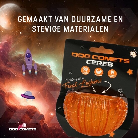 De Ceres van Dog Comets is gemaakt van hoogwaardige en niet-giftige materialen en is bestand tegen zelfs de meest enthousiaste speelsessies. Dankzij het gestructureerde oppervlak en de unieke vorm kan je hond hem gemakkelijk vastpakken en dragen, wat een extra laagje opwinding toevoegt aan hun speeltijd.