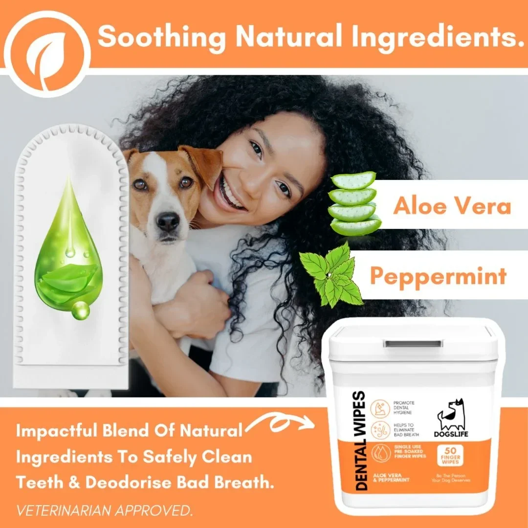 OurDogsLife Dental Wipes zijn gemaakt met een natuurlijke formule met aloë vera & pepermunt die een slechte adem op natuurlijke wijze neutraliseert en tandsteen en tandplak verwijdert. De doekjes zijn geschikt voor dagelijks gebruik, en het vingervormige ontwerp helpt om zacht te kunnen reinigen.