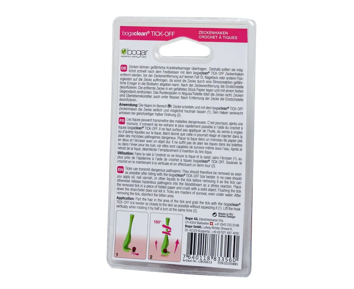 Teken kunnen gevaarlijke ziekteverwekkers overbrengen. Daarom moeten ze zo snel mogelijk na de beet worden verwijderd met de Bogaclean Tick-Off tekenhaak.