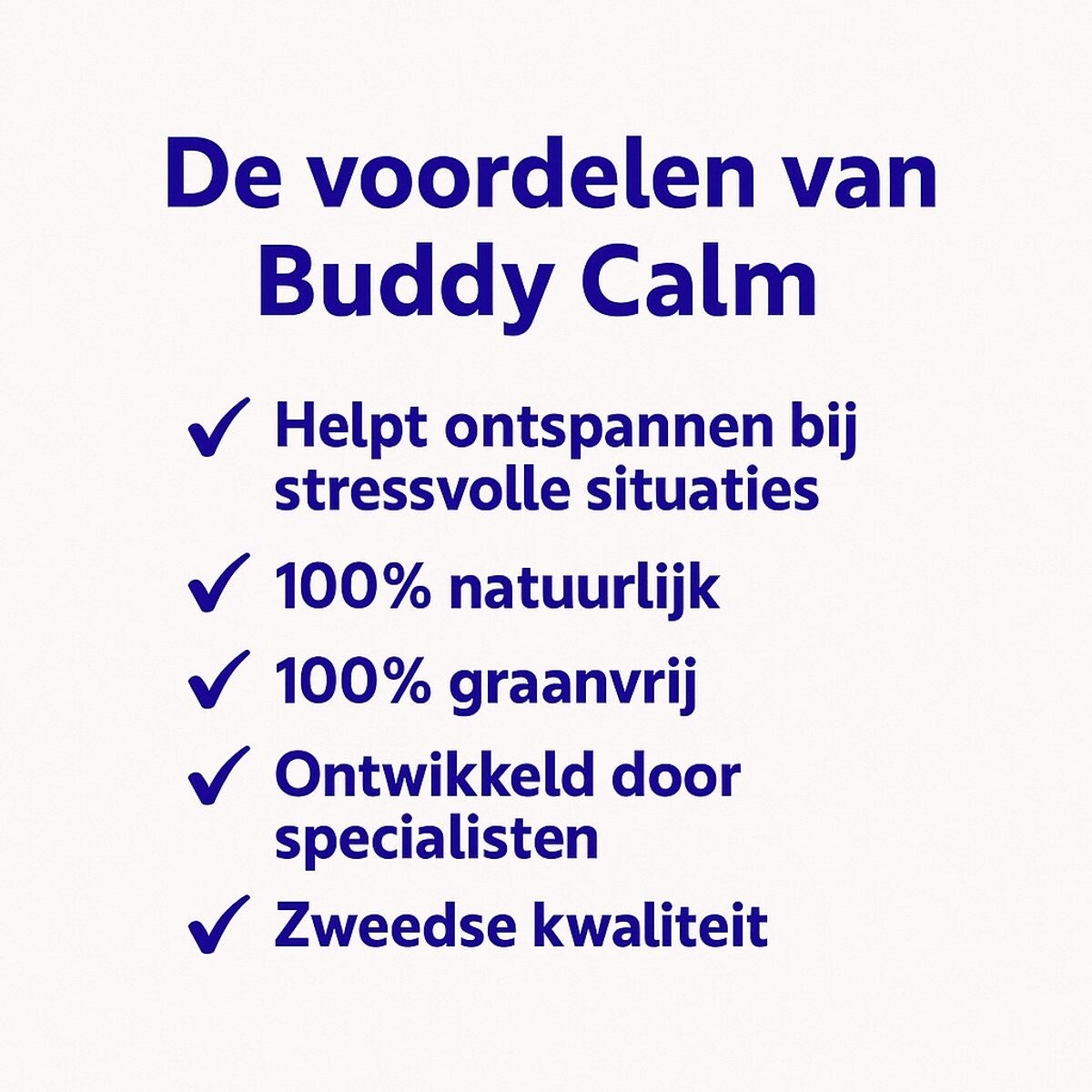 BUDDY Care Calm 150 gr. Heeft jouw hond snel last van stress of angst? Help je hond kalm en ontspannen te zijn met de Buddy Care Calm chews. Dit natuurlijke kalmeringsmiddel is speciaal ontwikkeld voor hyperactieve honden, honden die gevoelig zijn voor geluid of worden blootgesteld aan stressvolle situaties.Het kalmeringsmiddel is makkelijk te doseren.