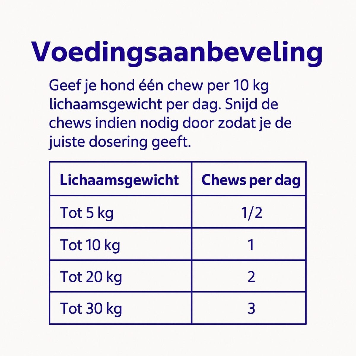 Per 10 kg lichaamsgewicht geef je één chew per dag aan je hond. Is je hond lichter dan 10 kg? Je snijdt de chews gemakkelijk in een kleiner deel, zodat de hoeveelheid past bij jouw hond.
